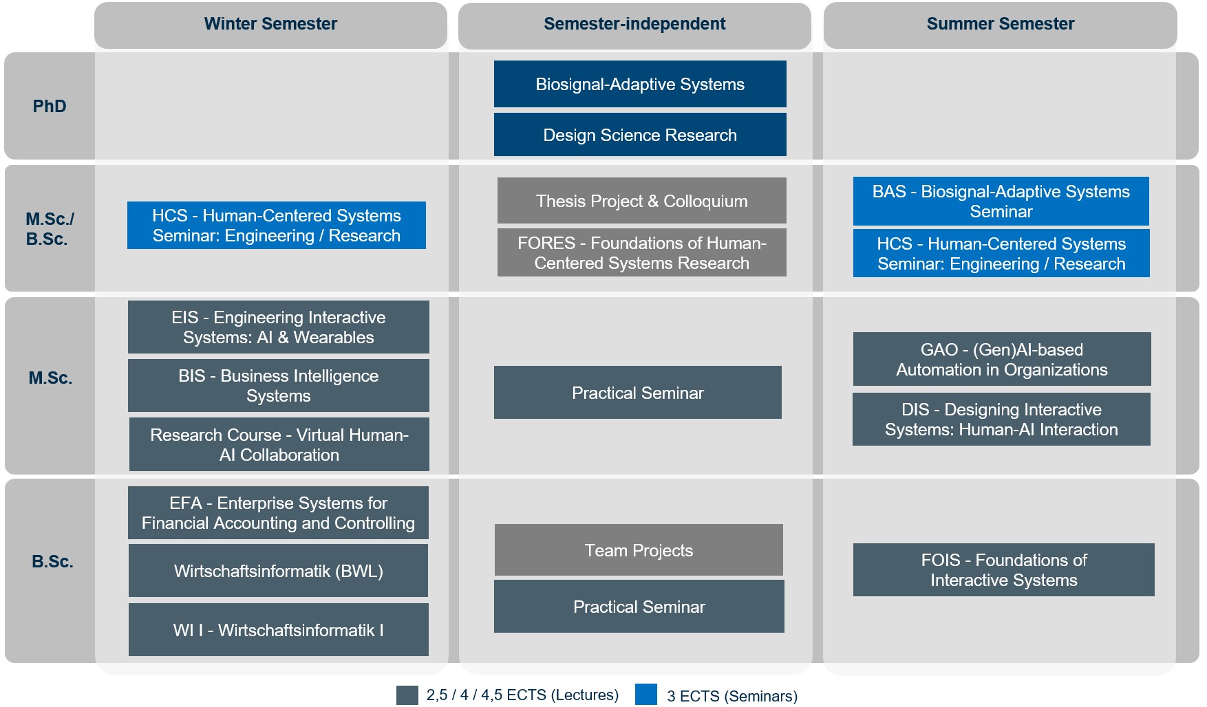 The human-centered systems lab (h-lab) headed by Prof. Maedche (research group “Information Systems I”) offers a comprehensive teaching program in the field of information systems and HCI, specifically human-centered systems.