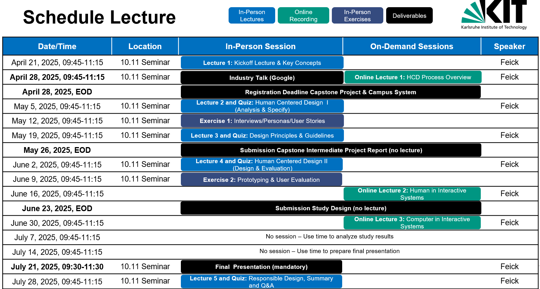 In case of questions feel free to approach Dr. Martin Feick (martin.feick@kit.edu). Die Erfolgskontrolle erfolgt in Form einer Prüfungsleistung anderer Art (Form) nach § 4 Abs. 2 Nr. 3 SPO. Die Leistungskontrolle erfolgt in Form einer einstündigen Klausur und der Durchführung eines Capstone Projektes. Details zur Ausgestaltung der Erfolgskontrolle werden im Rahmen der Vorlesung bekannt gegeben.