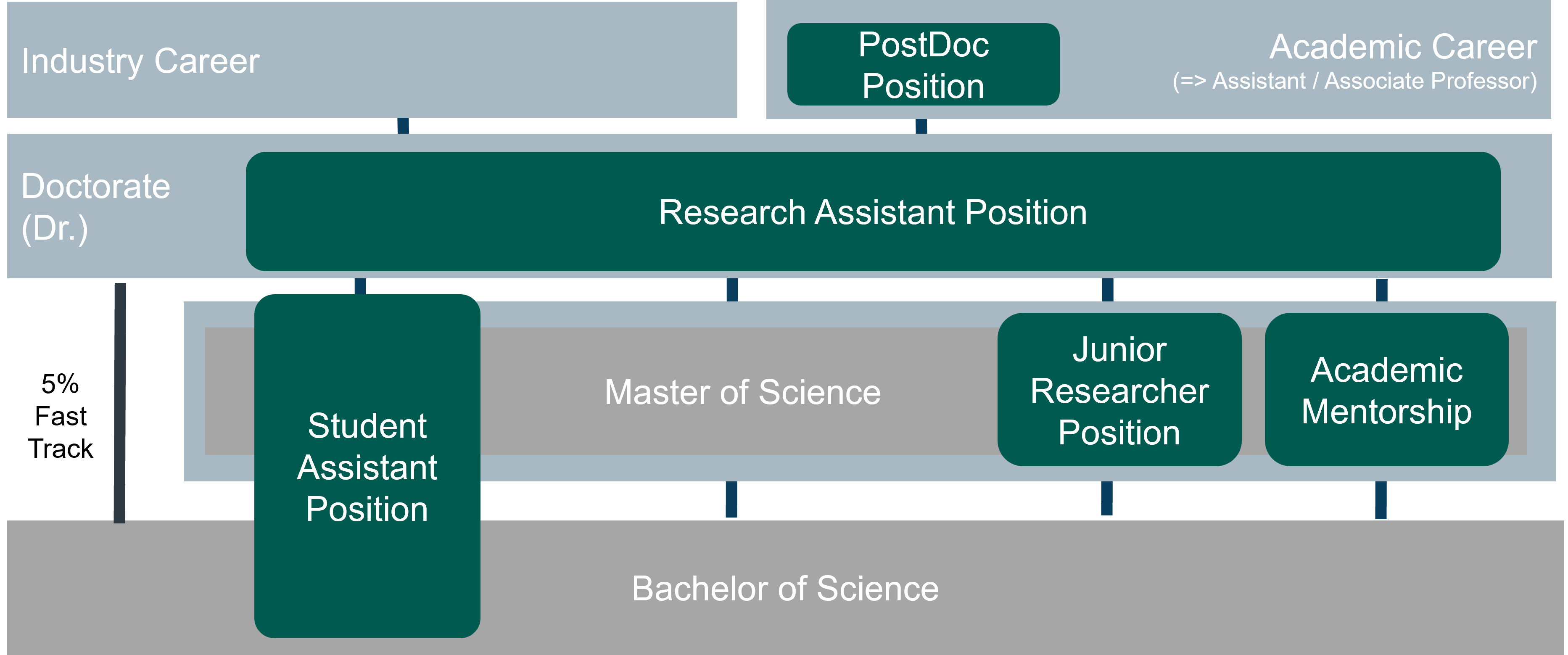 Becoming successful in academia is challenging. In order to support young talents, we have designed several development opportunities for academic careers in the Information Systems discipline. We offer the following academic career paths: